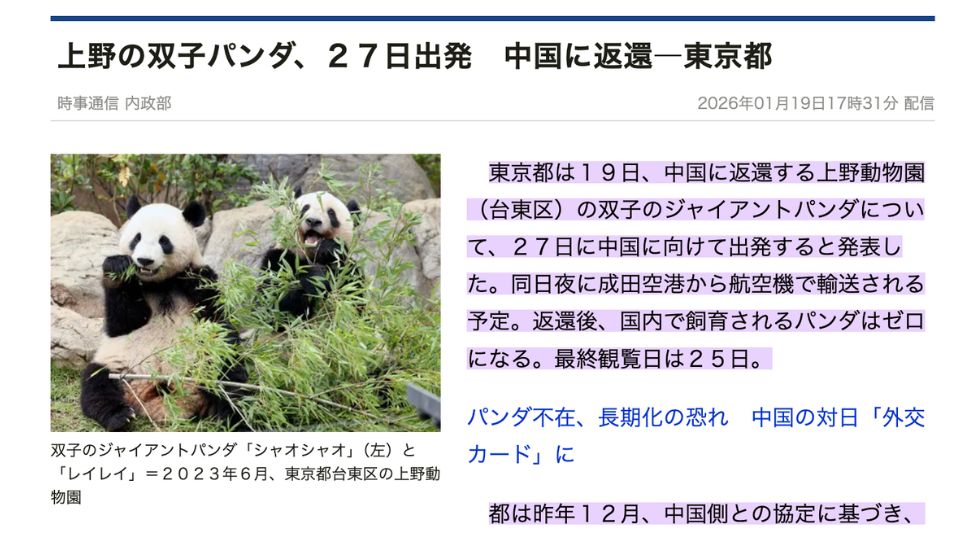 (報道)シャオレイ出発日は1月27日に決定-2026/01/19(月)