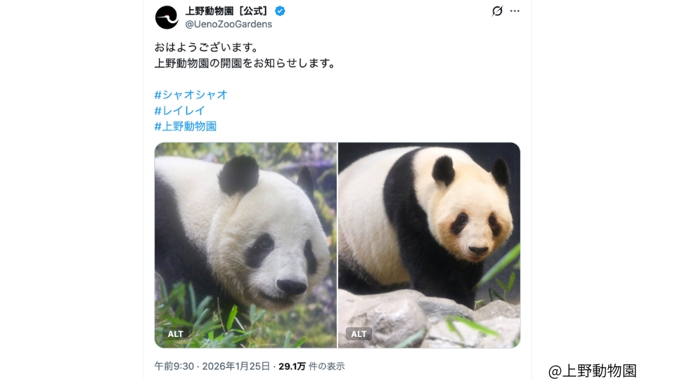 上野動物園の開園をお知らせします。#シャオシャオ#レイレイ#上野動物園 pic.twitter.com/5iHG6ZcNlx— 上野動物園[公式] (@UenoZooGardens) January 25, 2026