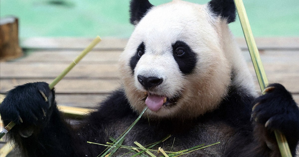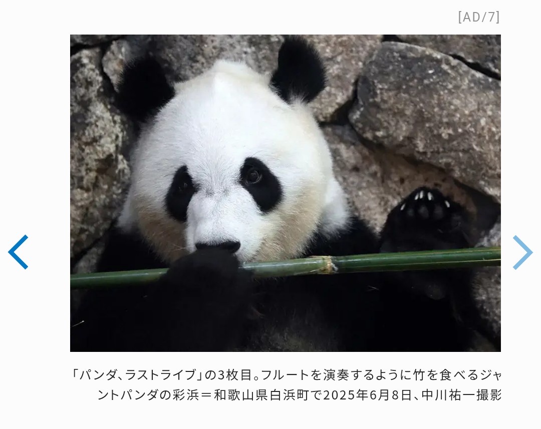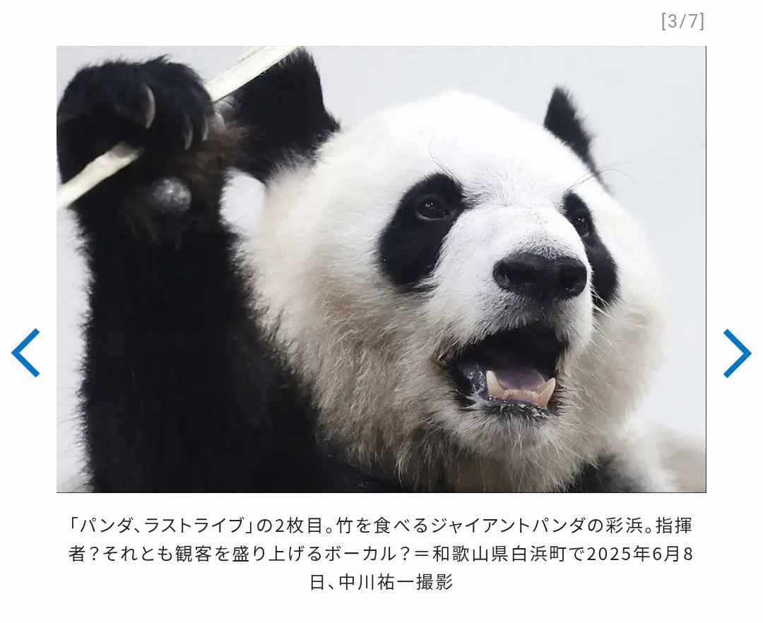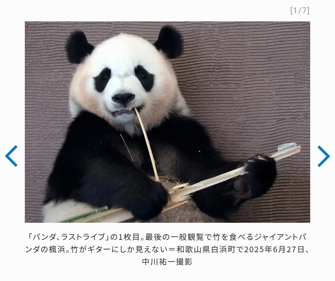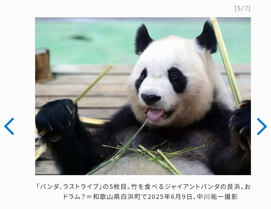 「パンダ、ラストライブ」の5枚目。竹を食べるジャイアントパンダの良浜。お腹がドラム?=和歌山県白浜町で2025年6月9日、中川祐一撮影