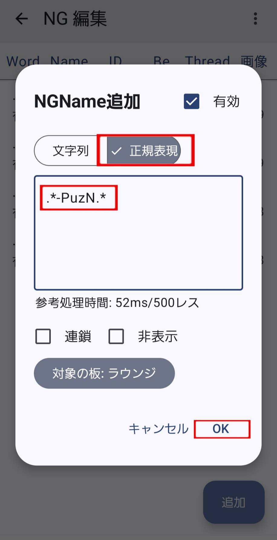 4.『正規表現』を選択し、NGリストをペーストして『OK』