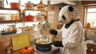 風呂敷で包まれた箱をしっかりと抱えて、子パンダさんがトコトコと行く先は上野の新築豪邸。